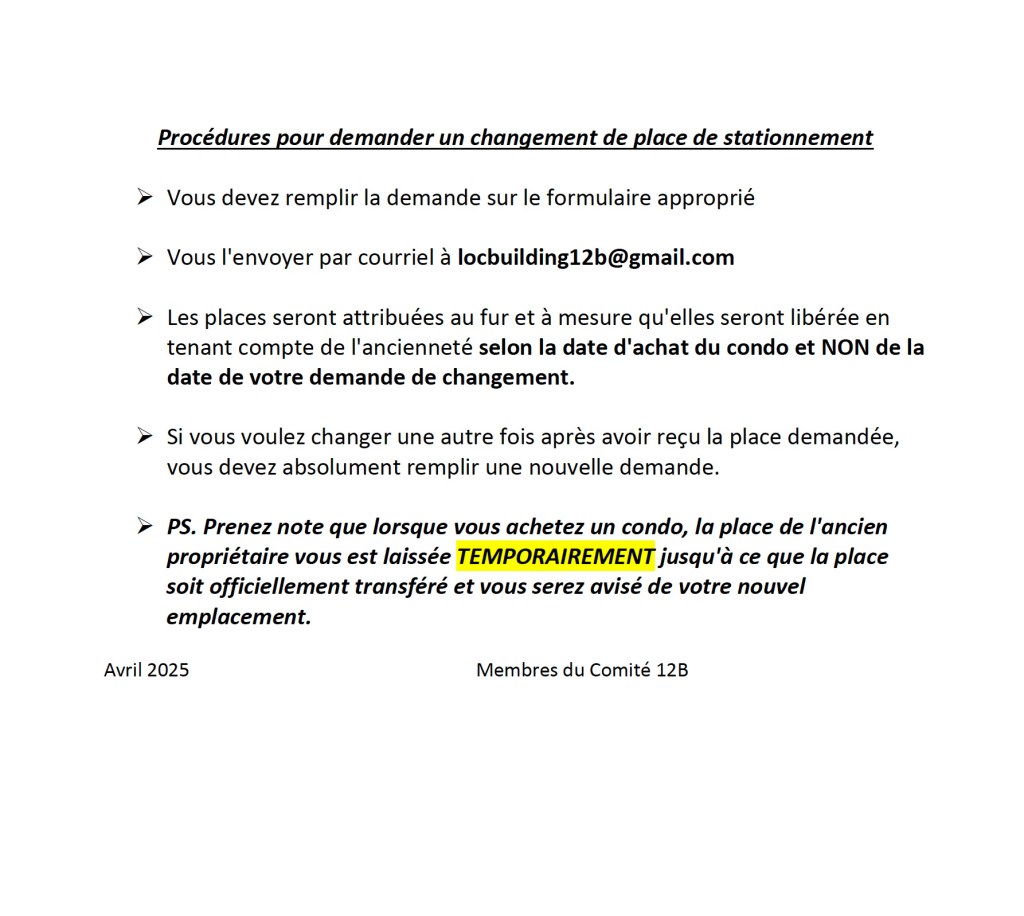 Procédures pour demander un changement de place de stationnement